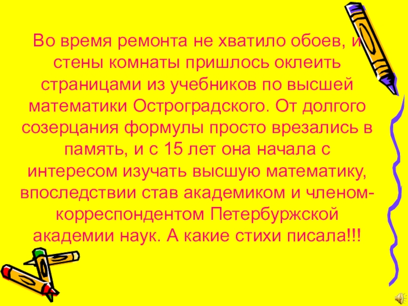 оклеить страницами из учебников по высшей математики Остроградского. От долгого созерцания формулы просто врезались в память, и с 15 лет она начала с интересом изучать высшую математику, впоследствии став академиком и членом-корреспондентом Петербуржской академии наук. А какие стихи писала!!!