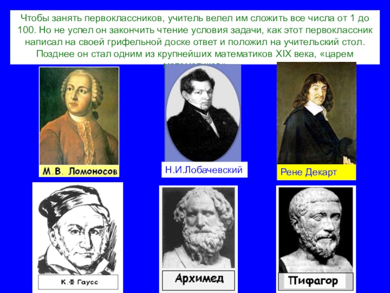 до 100. Но не успел он закончить чтение условия задачи, как этот первоклассник написал на своей грифельной доске ответ и положил на учительский стол.