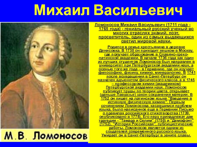 Родился в семье крестьянина в деревне Денисовка. В 1730 он приходит пешком в Москву, где получает образование в Славяно-греко-латинской академии. В начале 1736 года как один из лучших студентов Ломоносов был направлен в университет при Петербургской академии наук, а осенью того же года – в Германию, где он изучает философию, физику, химию, минералогию. В 1741 после возвращения в Санкт-Петербург он назначен адъюнктом физического класса, а в 1745 – профессором химии (академиком) Петербургской академии наук. Ломоносов публикует труды по теории цвета, открывает (раньше Лавуазье) закон сохранения материи. В 1752 он пишет на латинском языке "Введение в истинную физическую химию". Первым сочинением Ломоносова, касавшимся проблем языка, было написанное еще в Германии Письмо о правилах российского стихотворства (1739, опубликовано в 1778). Его перу принадлежат две трагедии - "Тамара и Селим" (1750) и "Демофонт" (1752), "История Российская", публицистические работы. Ломоносов является одним из создателей современного русского языка. Умирает он в Санкт-Петербург в зените славы.