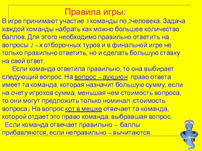 каждой команды набрать как можно большее количество баллов. Для этого необходимо правильно ответить на вопросы 2 – х отборочных туров и в финальной игре не только правильно ответить, но и сделать большую ставку на свой ответ.
