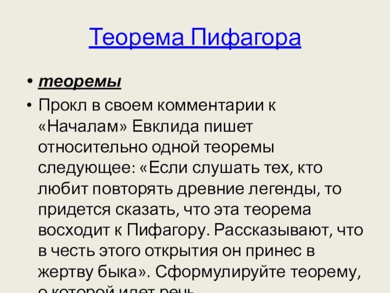 теоремы следующее: «Если слушать тех, кто любит повторять древние легенды, то придется сказать, что эта теорема восходит к Пифагору. Рассказывают, что в честь этого открытия он принес в жертву быка». Сформулируйте теорему, о которой идет речь.