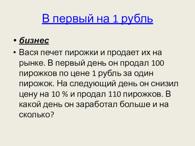 рынке. В первый день он продал 100 пирожков по цене 1 рубль за один пирожок. На следующий день он снизил цену на 10 % и продал 110 пирожков. В какой день он заработал больше и на сколько?