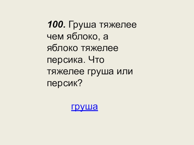Слайд 17100. Груша тяжелее чем яблоко, а яблоко тяжелее персика. Что тяжелее