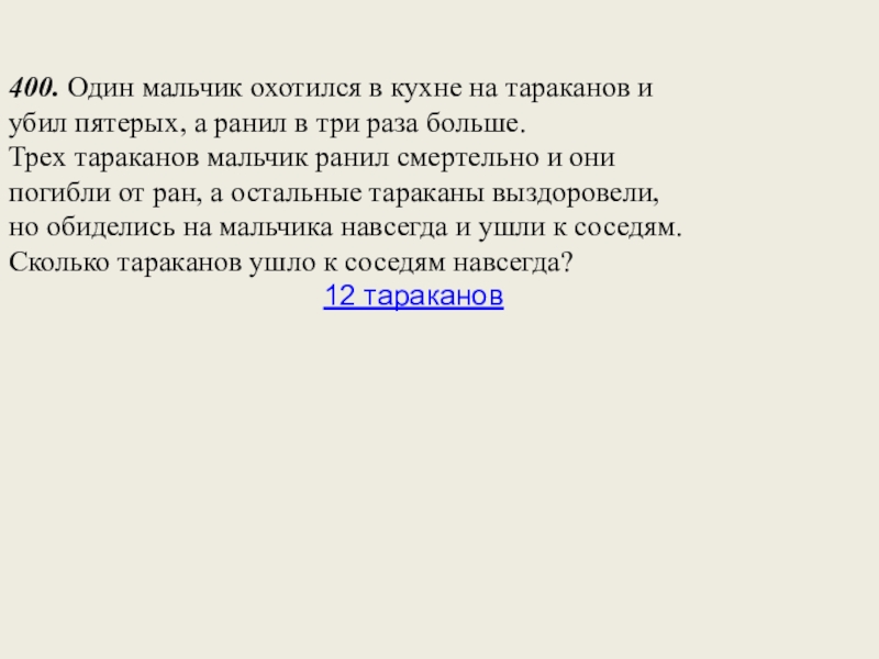 Слайд 11400. Один мальчик охотился в кухне на тараканов и убил пятерых,