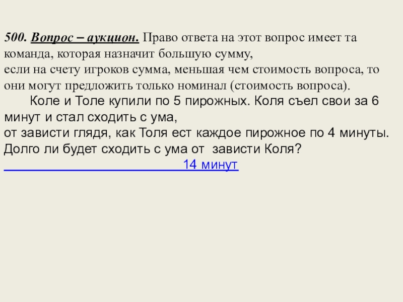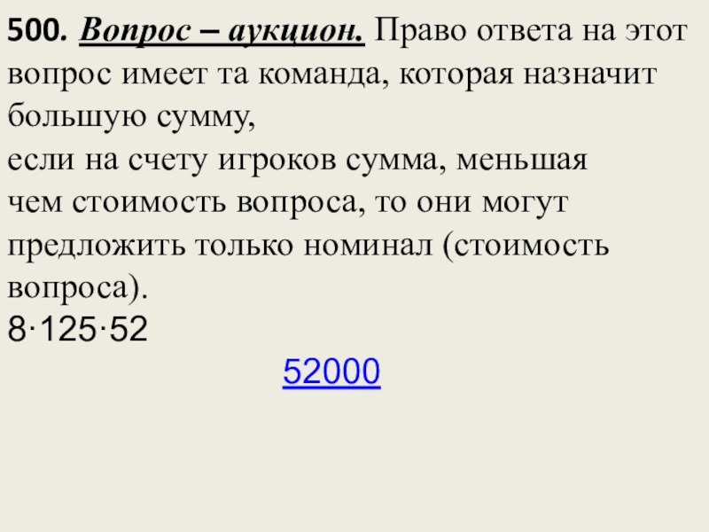 Слайд 10500. Вопрос – аукцион. Право ответа на этот вопрос имеет та