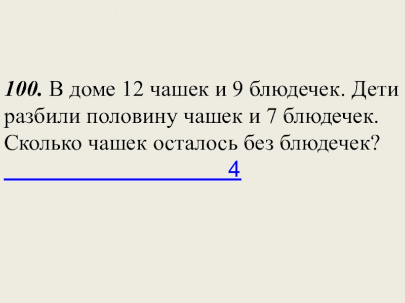 Слайд 2100. В доме 12 чашек и 9 блюдечек. Дети разбили половину
