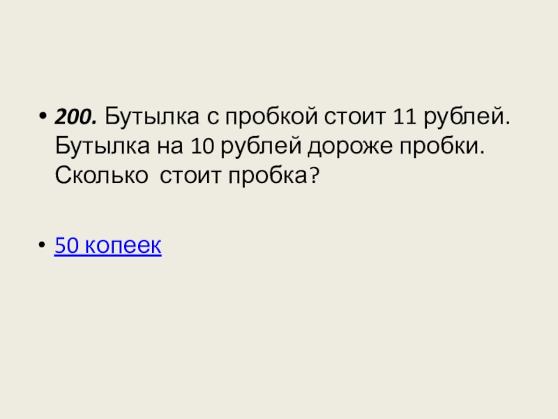 200. Бутылка с пробкой стоит 11 рублей. Бутылка на 10 рублей