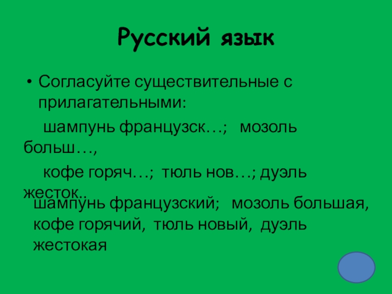 шампунь французский; мозоль большая, кофе горячий, тюль новый, дуэль жестокая