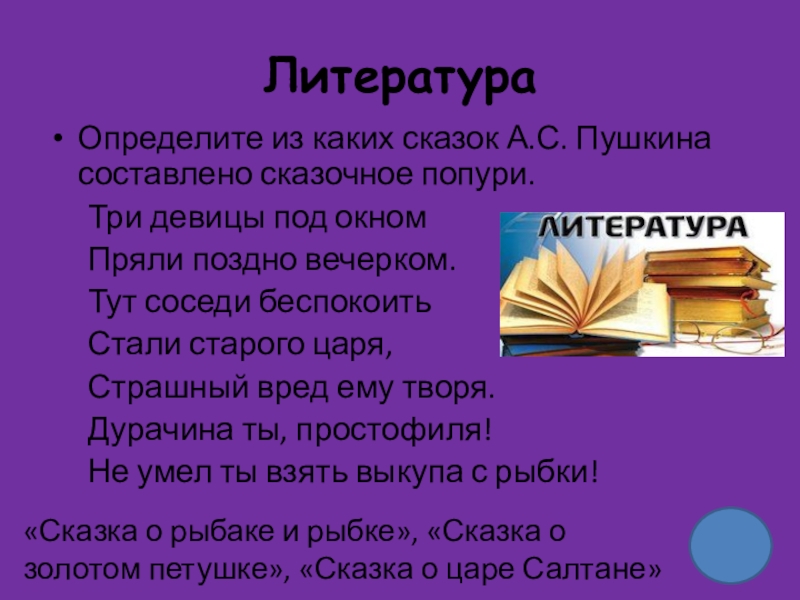 «Сказка о рыбаке и рыбке», «Сказка о золотом петушке», «Сказка о царе Салтане»
