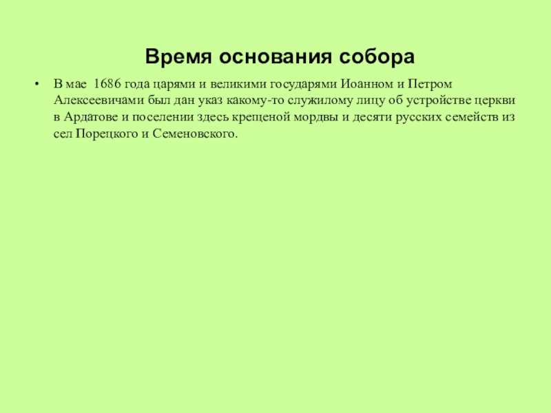 Иоанном и Петром Алексеевичами был дан указ какому-то служилому лицу об устройстве церкви в Ардатове и поселении здесь крещеной мордвы и десяти русских семейств из сел Порецкого и Семеновского.