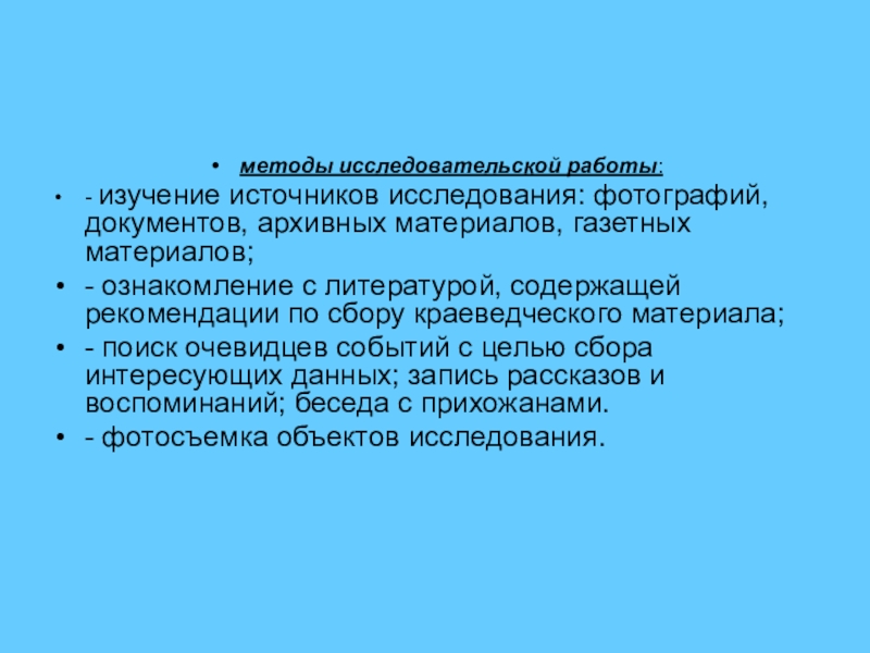 - поиск очевидцев событий с целью сбора интересующих данных; запись рассказов и воспоминаний; беседа с прихожанами.