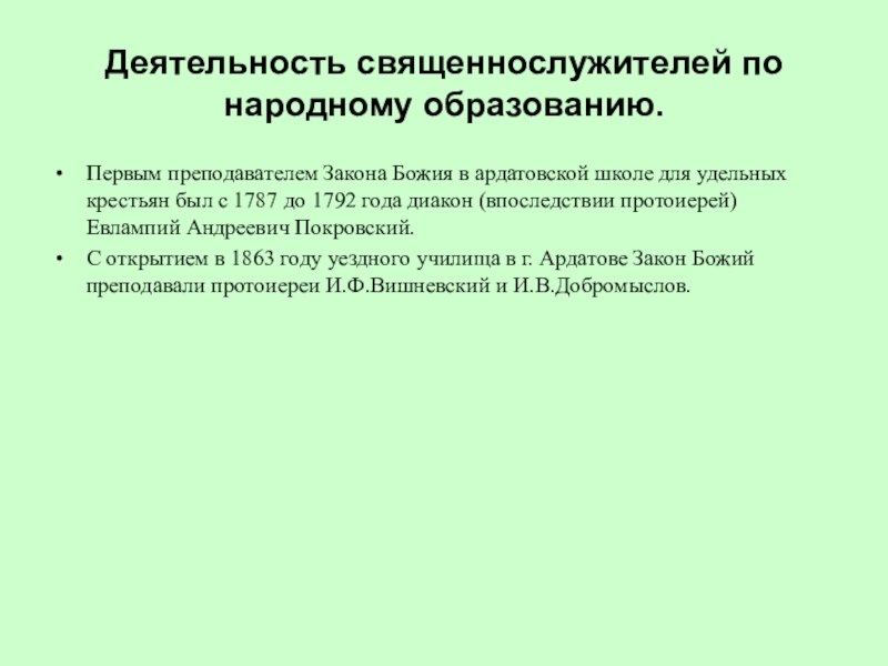 С открытием в 1863 году уездного училища в г. Ардатове Закон Божий преподавали протоиереи И.Ф.Вишневский и И.В.Добромыслов.