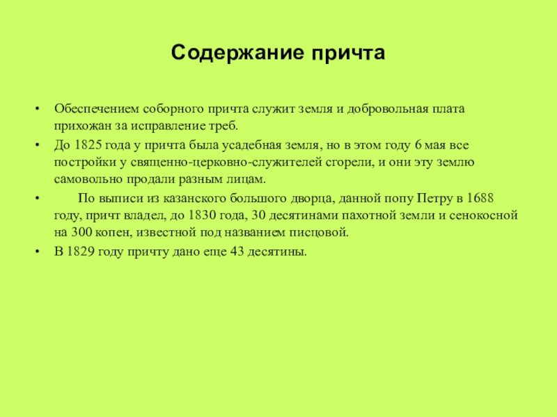 До 1825 года у причта была усадебная земля, но в этом году 6 мая все постройки у священно-церковно-служителей сгорели, и они эту землю самовольно продали разным лицам.