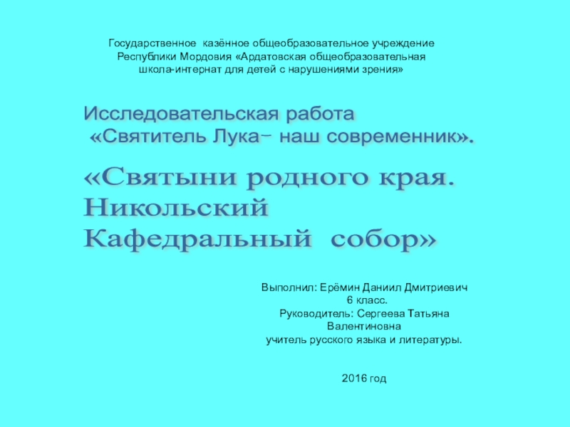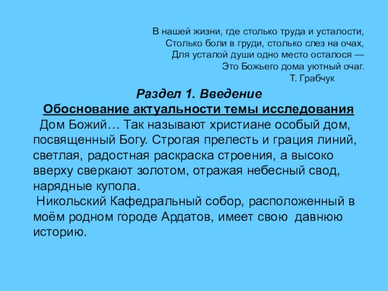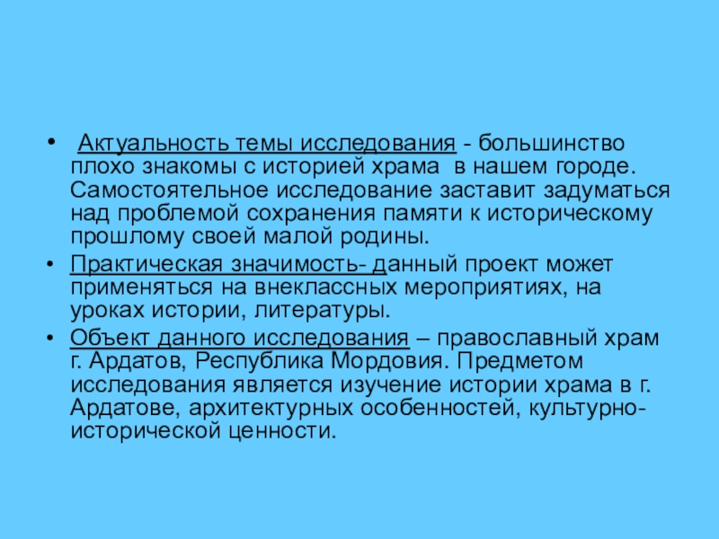 Объект данного исследования – православный храм г. Ардатов, Республика Мордовия. Предметом исследования является изучение истории храма в г. Ардатове, архитектурных особенностей, культурно-исторической ценности.