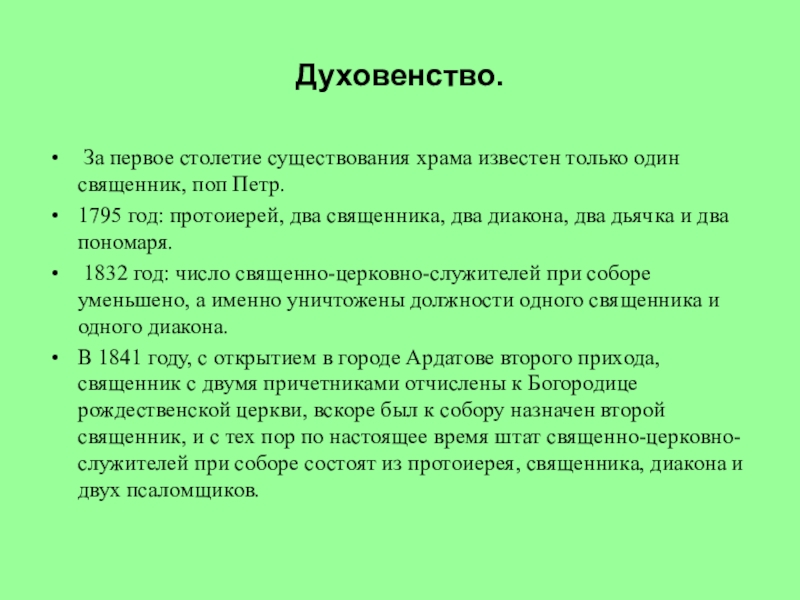 В 1841 году, с открытием в городе Ардатове второго прихода, священник с двумя причетниками отчислены к Богородице рождественской церкви, вскоре был к собору назначен второй священник, и с тех пор по настоящее время штат священно-церковно-служителей при соборе состоят из протоиерея, священника, диакона и двух псаломщиков.