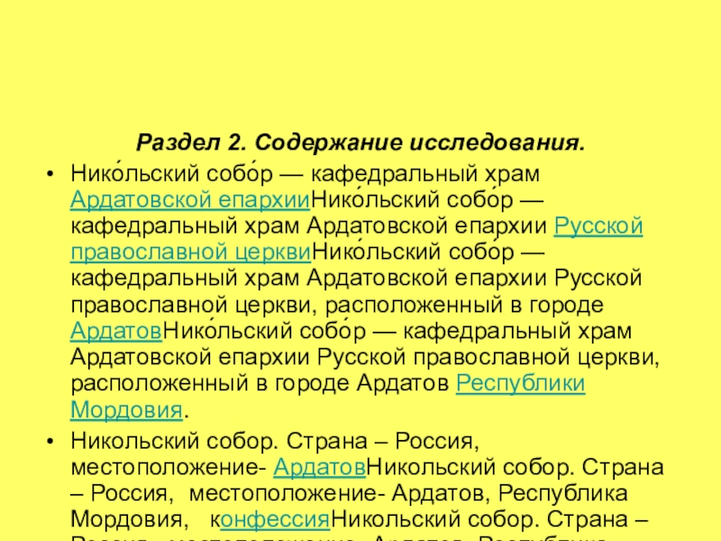 Никольский собор. Страна – Россия, местоположение- АрдатовНикольский собор. Страна – Россия, местоположение- Ардатов, Республика Мордовия, конфессияНикольский собор. Страна – Россия, местоположение- Ардатов, Республика Мордовия, конфессия- православиеНикольский собор. Страна – Россия, местоположение- Ардатов, Республика Мордовия, конфессия- православие, ЕпархияНикольский собор. Страна – Россия, местоположение- Ардатов, Республика Мордовия, конфессия- православие, Епархия-Ардатовская и Атяшевская. Дата основания- 1809, статус- Объект культурного наследия РФ.