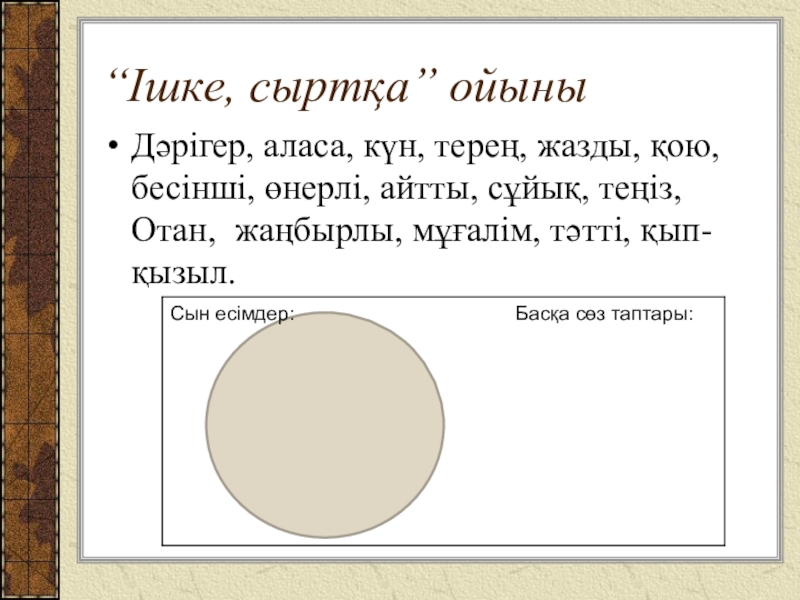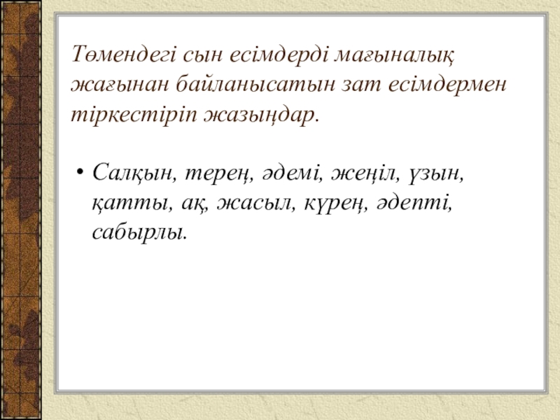Төмендегі сын есімдерді мағыналық жағынан байланысатын зат есімдермен тіркестіріп жазыңдар.