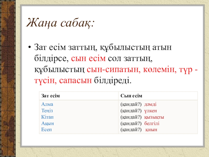 Зат есім заттың, құбылыстың атын білдірсе, сын есім сол заттың,