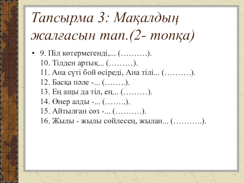Слайд 16Тапсырма 3: Мақалдың жалғасын тап.(2- топқа)