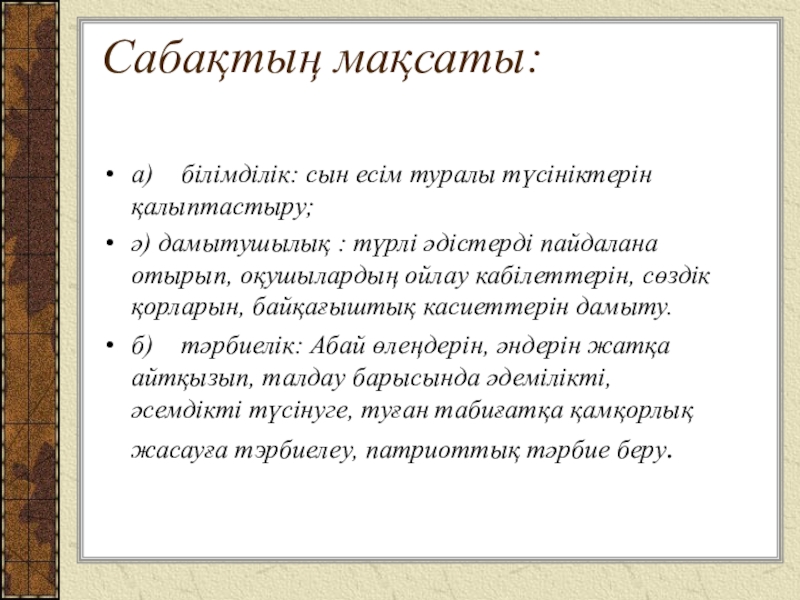 б) тәрбиелік: Абай өлеңдерін, әндерін жатқа айтқызып, талдау барысында әдемілікті,