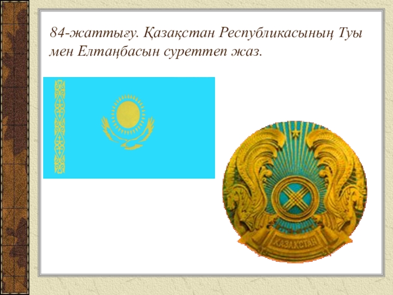 Слайд 1184-жаттығу. Қазақстан Республикасының Туы мен Елтаңбасын суреттеп жаз.