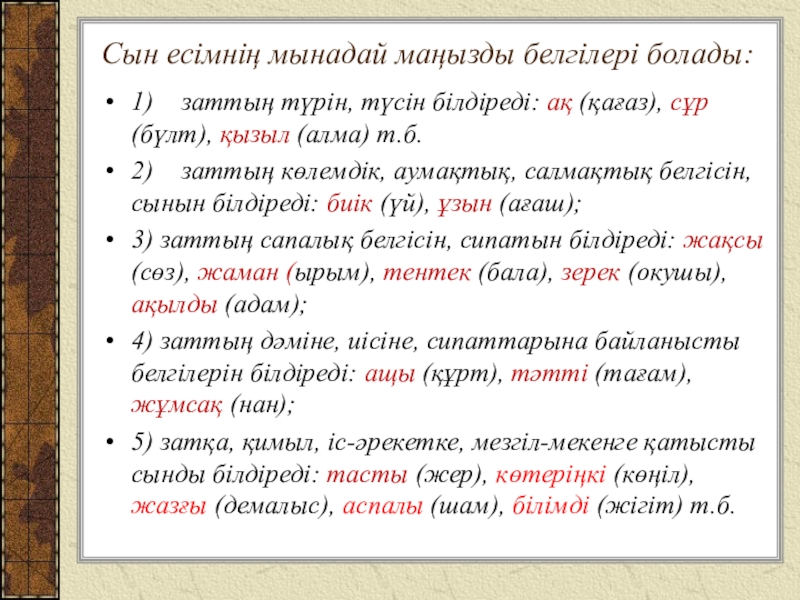 3) заттың сапалық белгісін, сипатын білдіреді: жақсы (сөз), жаман (ырым), тентек (бала), зерек (окушы), ақылды (адам);