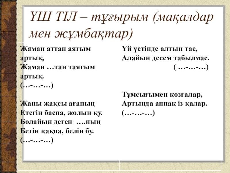 Слайд 14ҮШ ТІЛ – тұғырым (мақалдар мен жұмбақтар)