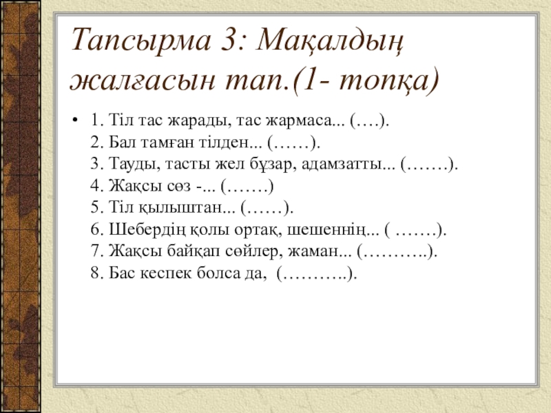 Слайд 15Тапсырма 3: Мақалдың жалғасын тап.(1- топқа)