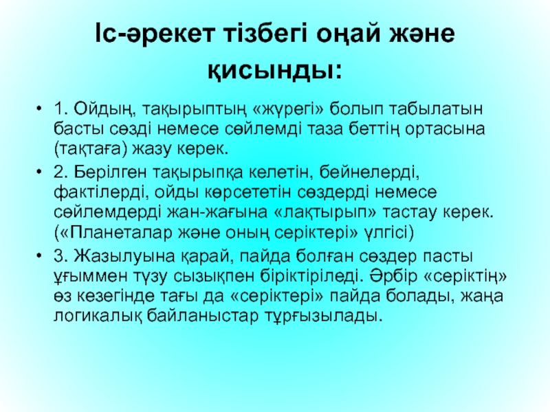 2. Берілген тақырыпқа келетін, бейнелерді, фактілерді, ойды көрсететін сөздерді немесе сөйлемдерді жан-жағына «лақтырып» тастау керек. («Планеталар және оның серіктері» үлгісі)