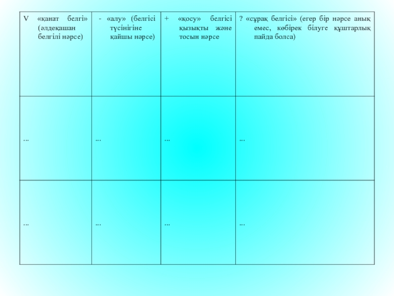 V «қанат белгімен» оқушыларға әлдеқашан белгілі нәрсе белгіленеді; - «алу» белгісімен олардың түсінігіне қайшы нәрсе белгіленеді; + «қосу» белгісімен оларға қызықты және тосын нәрсе белгіленеді; ? «сұрақ белгісі» егер, бір нәрсе анық емес, көбірек білуге құштарлық пайда болса қойылады.