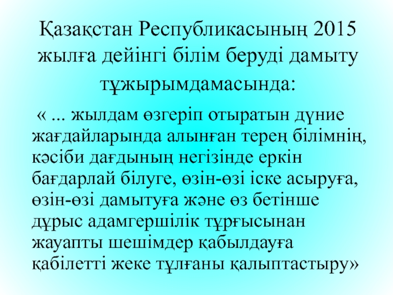 Слайд 2Қазақстан Республикасының 2015 жылға дейінгі білім беруді дамыту тұжырымдамасында: