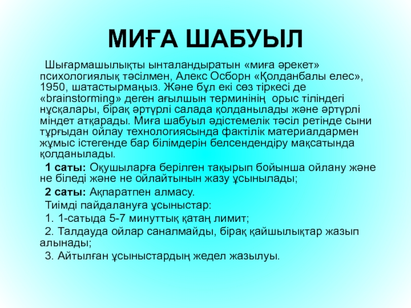 1950, шатастырмаңыз. Және бұл екі сөз тіркесі де «brainstorming» деген ағылшын терминінің орыс тіліндегі нұсқалары, бірақ әртүрлі салада қолданылады және әртүрлі міндет атқарады. Миға шабуыл әдістемелік тәсіл ретінде сыни тұрғыдан ойлау технологиясында фактілік материалдармен жұмыс істегенде бар білімдерін белсендендіру мақсатында қолданылады.