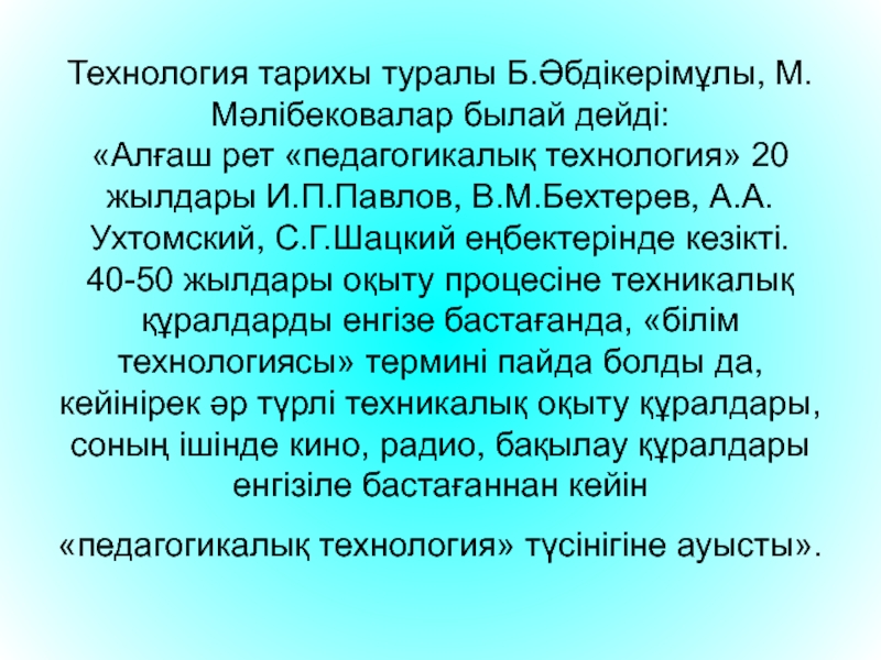 Слайд 4Технология тарихы туралы Б.Әбдікерімұлы, М.Мәлібековалар былай дейді: