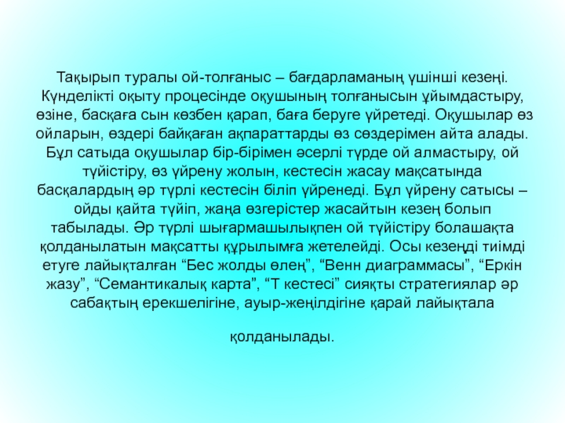 толғанысын ұйымдастыру, өзіне, басқаға сын көзбен қарап, баға беруге үйретеді. Оқушылар өз ойларын, өздері байқаған ақпараттарды өз сөздерімен айта алады. Бұл сатыда оқушылар бір-бірімен әсерлі түрде ой алмастыру, ой түйістіру, өз үйрену жолын, кестесін жасау мақсатында басқалардың әр түрлі кестесін біліп үйренеді. Бұл үйрену сатысы – ойды қайта түйіп, жаңа өзгерістер жасайтын кезең болып табылады. Әр түрлі шығармашылықпен ой түйістіру болашақта қолданылатын мақсатты құрылымға жетелейді. Осы кезеңді тиімді етуге лайықталған “Бес жолды өлең”, “Венн диаграммасы”, “Еркін жазу”, “Семантикалық карта”, “Т кестесі” сияқты стратегиялар әр сабақтың ерекшелігіне, ауыр-жеңілдігіне қарай лайықтала қолданылады.
