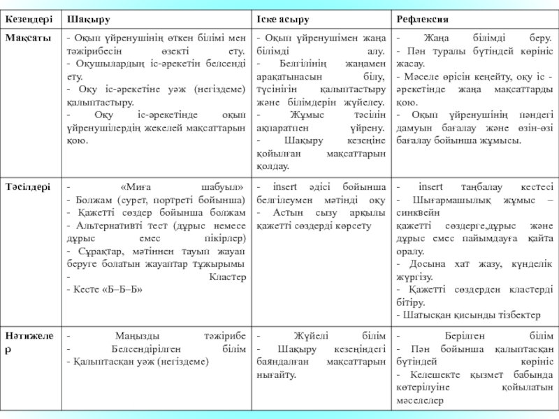 ИНСЕРТ-тің кезеңдері үш сатыға сәйкес: шақыру, ұғыну, рефлексия