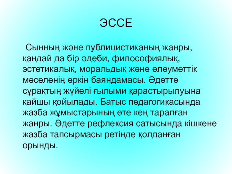 моральдық және әлеуметтік мәселенің еркін баяндамасы. Әдетте сұрақтың жүйелі ғылыми қарастырылуына қайшы қойылады. Батыс педагогикасында жазба жұмыстарының өте кең таралған жанры. Әдетте рефлексия сатысында кішкене жазба тапсырмасы ретінде қолданған орынды.