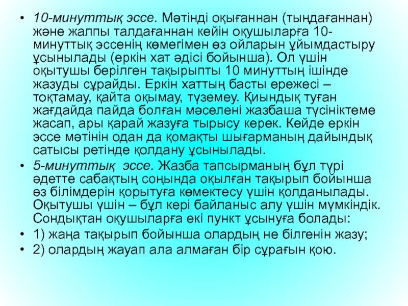 Слайд 3410-минуттық эссе. Мәтінді оқығаннан (тыңдағаннан) және жалпы талдағаннан кейін оқушыларға 10-минуттық
