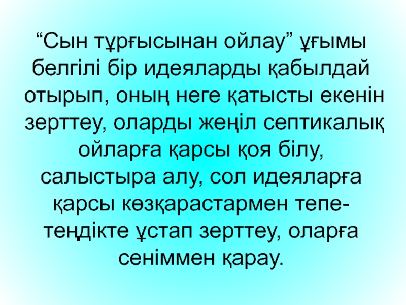 Слайд 14“Сын тұрғысынан ойлау” ұғымы белгілі бір идеяларды қабылдай отырып, оның неге