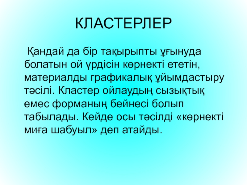 материалды графикалық ұйымдастыру тәсілі. Кластер ойлаудың сызықтық емес форманың бейнесі болып табылады. Кейде осы тәсілді «көрнекті миға шабуыл» деп атайды.