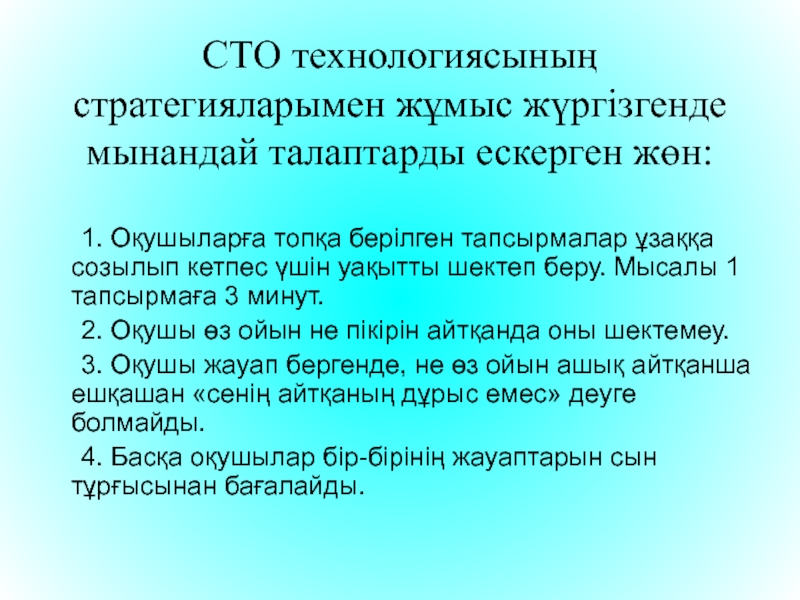 Слайд 39СТО технологиясының стратегияларымен жұмыс жүргізгенде мынандай талаптарды ескерген жөн: