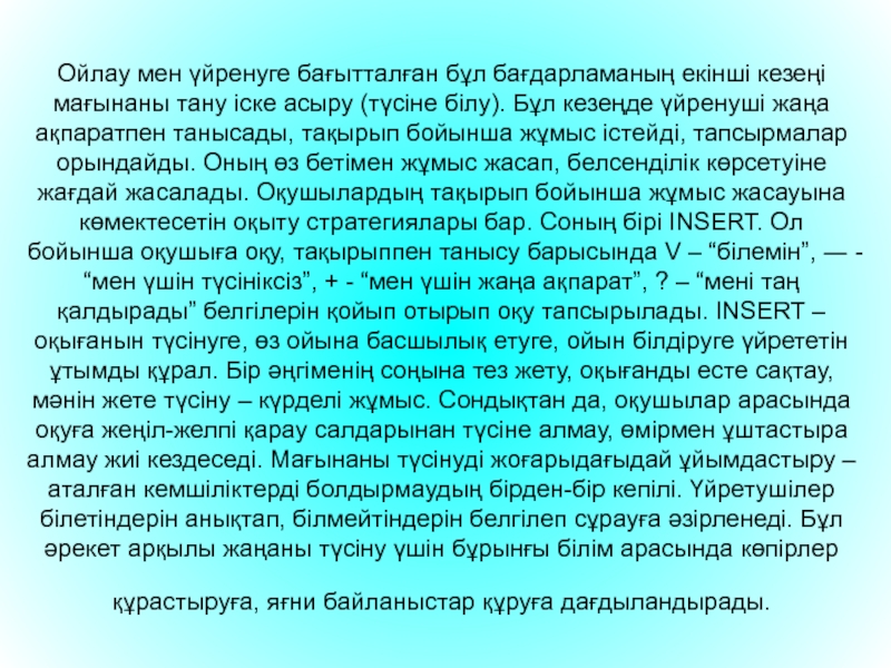асыру (түсіне білу). Бұл кезеңде үйренуші жаңа ақпаратпен танысады, тақырып бойынша жұмыс істейді, тапсырмалар орындайды. Оның өз бетімен жұмыс жасап, белсенділік көрсетуіне жағдай жасалады. Оқушылардың тақырып бойынша жұмыс жасауына көмектесетін оқыту стратегиялары бар. Соның бірі INSERT. Ол бойынша оқушыға оқу, тақырыппен танысу барысында V – “білемін”, ― - “мен үшін түсініксіз”, + - “мен үшін жаңа ақпарат”, ? – “мені таң қалдырады” белгілерін қойып отырып оқу тапсырылады. INSERT – оқығанын түсінуге, өз ойына басшылық етуге, ойын білдіруге үйрететін ұтымды құрал. Бір әңгіменің соңына тез жету, оқығанды есте сақтау, мәнін жете түсіну – күрделі жұмыс. Сондықтан да, оқушылар арасында оқуға жеңіл-желпі қарау салдарынан түсіне алмау, өмірмен ұштастыра алмау жиі кездеседі. Мағынаны түсінуді жоғарыдағыдай ұйымдастыру – аталған кемшіліктерді болдырмаудың бірден-бір кепілі. Үйретушілер білетіндерін анықтап, білмейтіндерін белгілеп сұрауға әзірленеді. Бұл әрекет арқылы жаңаны түсіну үшін бұрынғы білім арасында көпірлер құрастыруға, яғни байланыстар құруға дағдыландырады.