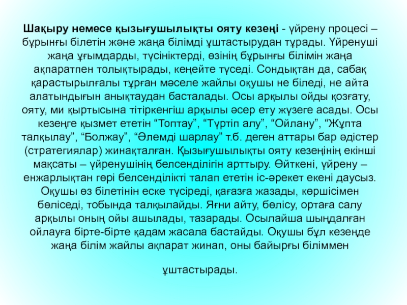 және жаңа білімді ұштастырудан тұрады. Үйренуші жаңа ұғымдарды, түсініктерді, өзінің бұрынғы білімін жаңа ақпаратпен толықтырады, кеңейте түседі. Сондықтан да, сабақ қарастырылғалы тұрған мәселе жайлы оқушы не біледі, не айта алатындығын анықтаудан басталады. Осы арқылы ойды қозғату, ояту, ми қыртысына тітіркенгіш арқылы әсер ету жүзеге асады. Осы кезеңге қызмет ететін “Топтау”, “Түртіп алу”, “Ойлану”, “Жұпта талқылау”, “Болжау”, “Әлемді шарлау” т.б. деген аттары бар әдістер (стратегиялар) жинақталған. Қызығушылықты ояту кезеңінің екінші мақсаты – үйренушінің белсенділігін арттыру. Өйткені, үйрену – енжарлықтан гөрі белсенділікті талап ететін іс-әрекет екені даусыз. Оқушы өз білетінін еске түсіреді, қағазға жазады, көршісімен бөліседі, тобында талқылайды. Яғни айту, бөлісу, ортаға салу арқылы оның ойы ашылады, тазарады. Осылайша шыңдалған ойлауға бірте-бірте қадам жасала бастайды. Оқушы бұл кезеңде жаңа білім жайлы ақпарат жинап, оны байырғы біліммен ұштастырады.