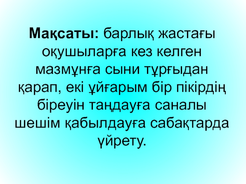 Слайд 13Мақсаты: барлық жастағы оқушыларға кез келген мазмұнға сыни тұрғыдан қарап, екі