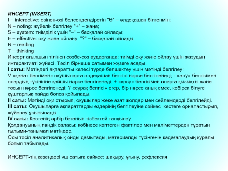 Инсерт ағылшын тілінен сөзбе-сөз аударғанда: тиімді оқу және ойлау үшін жазудың интерактивті жүйесі. Тәсіл бірнеше сатымен жүзеге асады.