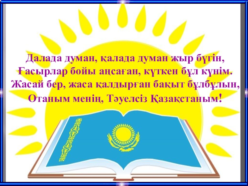 Кең байтақ , көз жетпейтін жерім менің,Таулы орман, жасыл жайлау көлім менің.Бүгінде бар әлемге даңқың жетті,Тәуелсіз Қазақстан