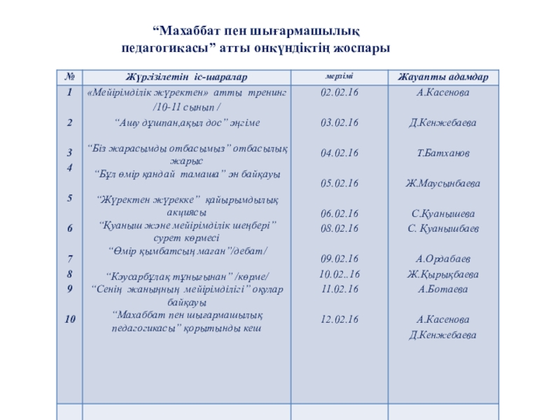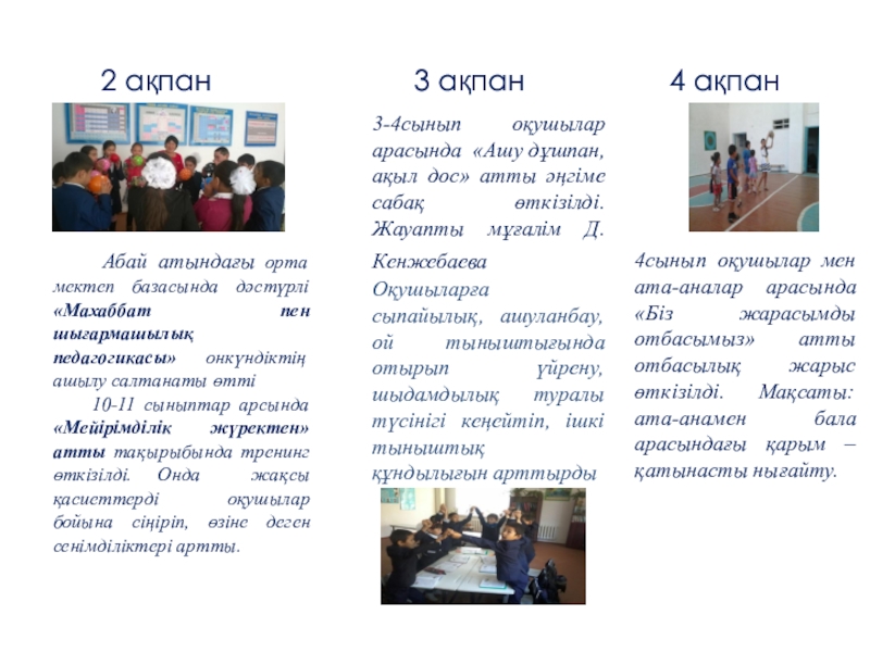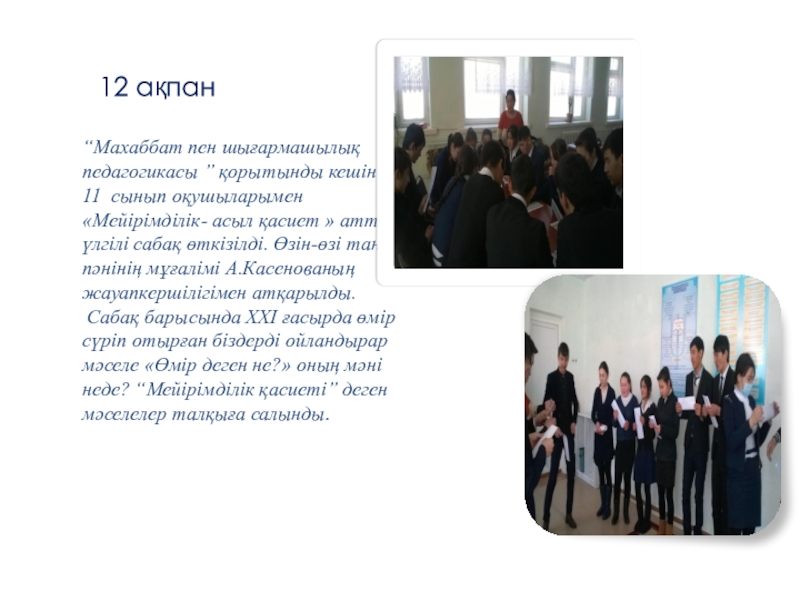 10-11 сыныптар арсында «Мейірімділік жүректен» атты тақырыбында тренинг өткізілді. Онда жақсы қасиеттерді оқушылар бойына сіңіріп, өзіне деген сенімділіктері артты.