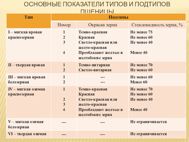 Слайд 11Основные показатели типов и подтипов пшеницы