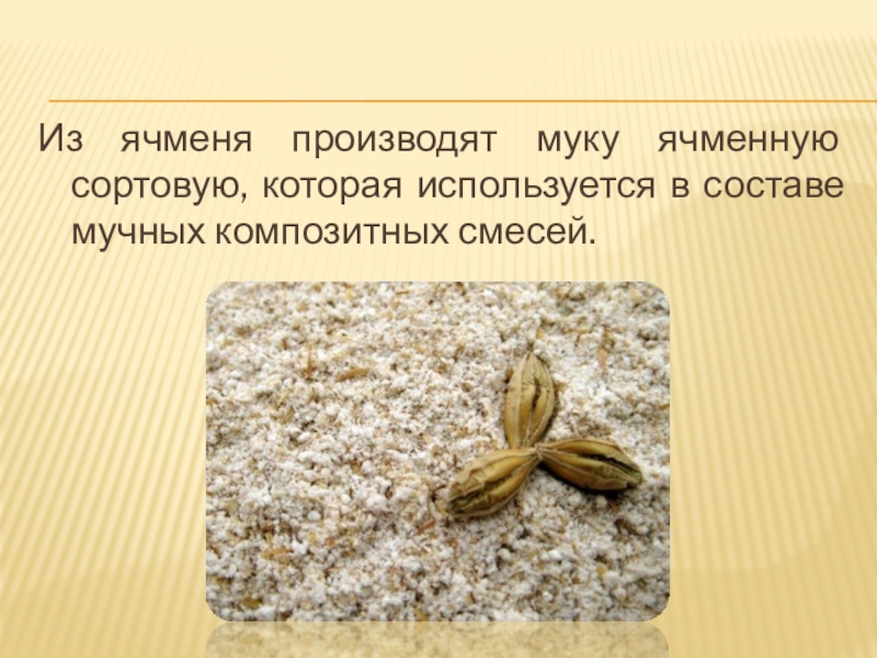 Слайд 21Из ячменя производят муку ячменную сортовую, которая используется в составе мучных