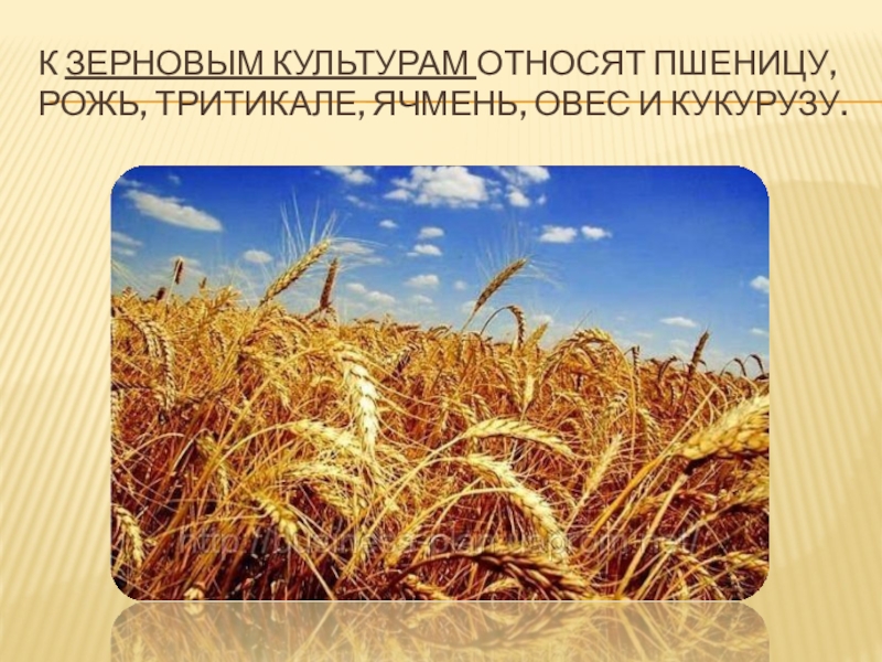 Слайд 7К зерновым культурам относят пшеницу, рожь, тритикале, ячмень, овес и кукурузу.