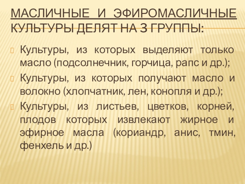Слайд 33Масличные и эфиромасличные культуры делят на 3 группы: